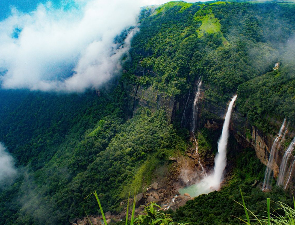 Located near Cherrapunji in the state of Meghalaya, resides the tallest plunging waterfall in India with a height of 340m in a unique shade of green. Nohkalikai Falls are fed by the rainwater collected during heavy rains.The power of the waterfall reduces during the dry season viz. from December to February. As the local legend goes, the waterfall is named after a woman named Likai, who jumped-off the edge of a plateau–the same place where the waterfall runs down today.